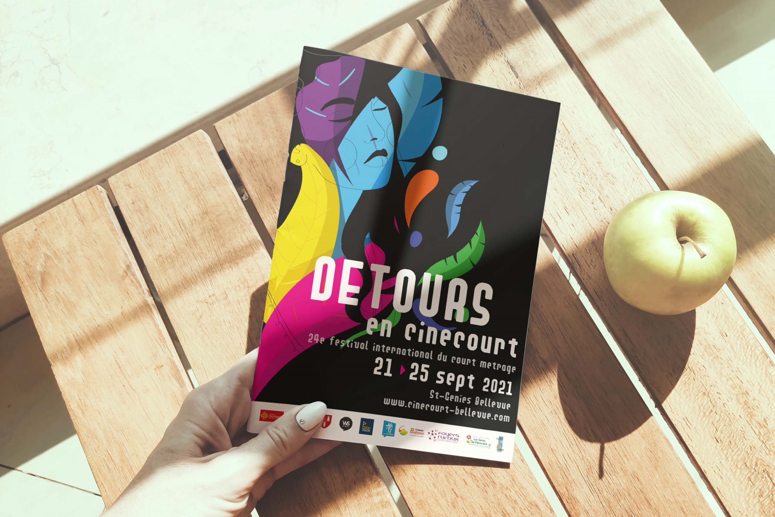 Mise en page d’une brochure de 16 pages format A5 Programme distribué pour le festival de court métrage « Détours en Cinécourt »